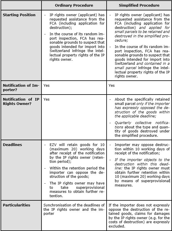 According to the planned bill, the ordinary procedure and the simplified procedure for the destruction of counterfeits can be compared as follows:
