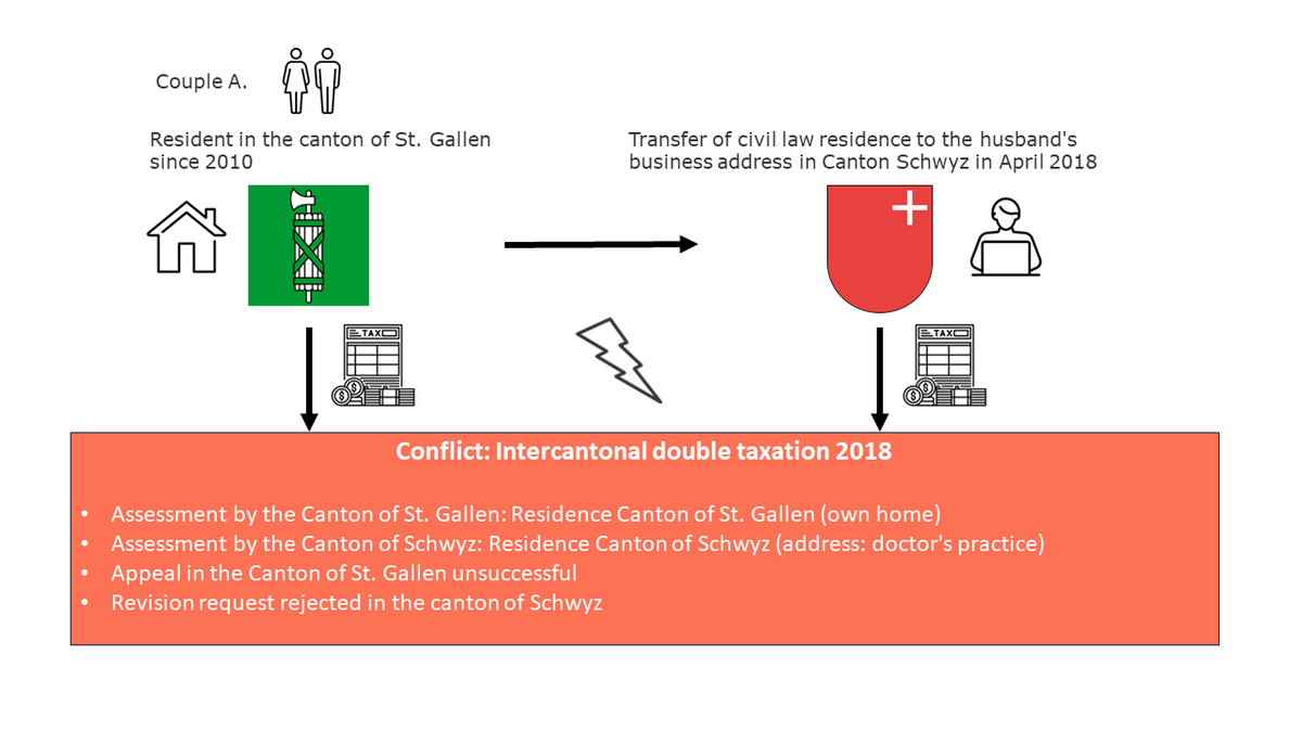 The ruling is based on the following facts: The married couple A. had been living with their two daughters in their own home in the canton of St. Gallen since 2010. The husband had been working as a self-employed doctor in the canton of Schwyz since 2011. Until the 2017 tax period, the assessment was carried out by the canton of St. Gallen. In April 2018, the couple deregistered in the canton of St. Gallen and gave the husband's practice address in the canton of Schwyz as their place of residence under civil law. In July 2020, the tax administration of the canton of Schwyz assessed the couple for the 2018 tax year at the couple's registered domicile in the canton of Schwyz. In January 2020, i.e. before the final assessment by the tax administration of the Canton of Schwyz, the tax administration of the Canton of St. Gallen informed the couple that the couple's tax domicile for 2018 would be clarified. At the same time, the tax administration requested additional information and documents. On August 24, 2020, a meeting finally took place between the couple, their representative and the responsible tax commissioner. In September 2020, the tax administration of the Canton of St. Gallen issued the final assessment decision and taxed the couple as residents of the Canton of St. Gallen. The change of residence to the canton of Schwyz could not be proven - only the address was changed, but not the place of residence. This resulted in effective intercantonal double taxation: the couple was taxed once in the canton of St. Gallen and once in the canton of Schwyz as having unlimited tax liability. The couple subsequently lodged various unsuccessful appeals against the St. Gallen assessment decision. At the same time, the couple submitted a request for a revision of the 2018 tax assessment in the canton of Schwyz. The tax authorities in the canton of Schwyz refused to consider the request.