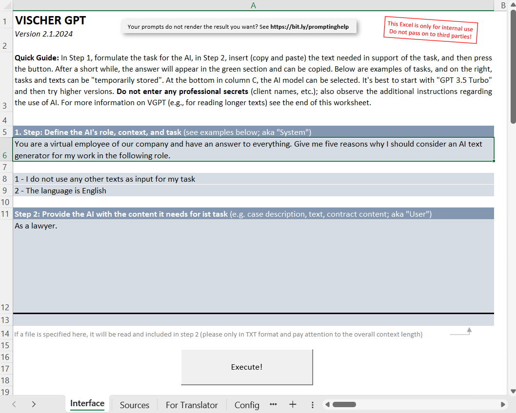 Originally, we only developed this tool for our own internal use. It is an Excel-based tool with which the various GPT models of OpenAI can be used for processing longer than usual texts. VISCHER GPT or VGPT, as we call it, is an AI text generator, i.e. it is not possible to chat with the AI. Rather, it can be given a task and content (e.g. a contract to be analyzed). Files in TXT format can also be imported. The tool then produces a response.