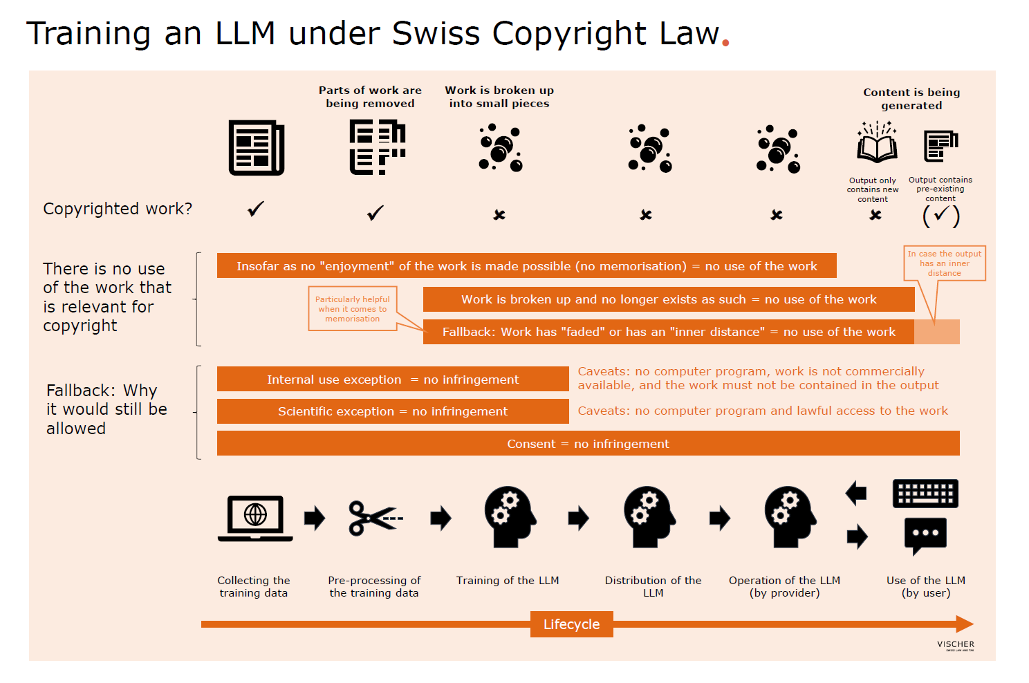 - The scientific exception (usually) applies. Even if the training of a large language model qualifies as a copyright-relevant use, it will regularly be covered by the so-called scientific exception (Art. 24d CopA). Although this exception presupposes lawful access to the content, any contractual prohibitions or conditions of use are likely to be regularly ineffective in this context. Furthermore, there is no opt-out right in Switzerland, as there is in EU copyright law within the framework of their "Text and Data Mining" (TDM) regulation. The key question in the context of this exception, namely whether the training of a language model constitutes a purpose of scientific research, is clearly to be answered in the affirmative according to our findings, as research is understood as a systematic, methodical search for new knowledge, regardless of the discipline – and this is precisely what the training of an AI model is about: it is intended to gain knowledge from the content presented to it. Commercial scientific research is also included in Switzerland. However, the scientific exception does not apply to computer programs. The other copyright exception that can apply is the internal use exception, which permits reproduction of works for internal information and documentation. One challenge here, however, is that it is not available for certain categories of work and the complete or substantial copying of a commercially obtainable work is not permitted. In practice, this can be countered with anti-memorisation techniques that remove parts of a text that are relevant to a human user without significantly impairing its value for the machine.