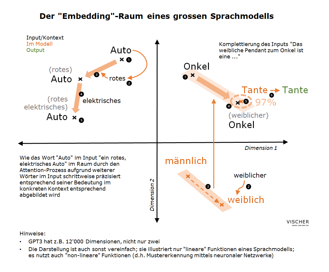 Begonnen wird mit den Koordinaten, die für jedes Wort in der ersten Ebene des Modells hinterlegt sind und gewissermassen eine erste, allgemeine Bedeutung des Wortes widerspiegeln. In den weiteren Schritten, die im Grunde aus vielen Wiederholungen derselben Grundprozesse bestehen, wird nun für jedes dieser Worte im Kontext die in der Tabelle vermerkten Koordinaten in diesem virtuellen Bedeutungs-Raum anhand der im Modell für jedes Wort und jeden Aspekt hinterlegten Zahlen laufend "zurechtgerückt", so dass sie immer genauer die Bedeutung des Wortes im konkreten Kontext des Inputs wiedergeben. Das passiert, indem die Koordinaten jedes Worts im Input mit den im Modell für jedes Wort und jeden Aspekt bereits hinterlegten Zahlen nach bestimmten Regeln abgeglichen werden. Das ist eine Rechenoperation, aus welcher vereinfacht gesagt die Zahlenwerte resultieren, um welche die 12'000 Zahlen eines jeden Worts (welche die jeweiligen Koordinaten auf den 12'000 Achsen des "Bedeutungs-Raums" repräsentieren) in der Tabelle bei jedem Schritt dieser Feinjustierung erhöht oder reduziert werden. Die Position des Worts in diesem multidimensionalen Raum verschiebt sich somit laufend, je mehr der Input analysiert wird.