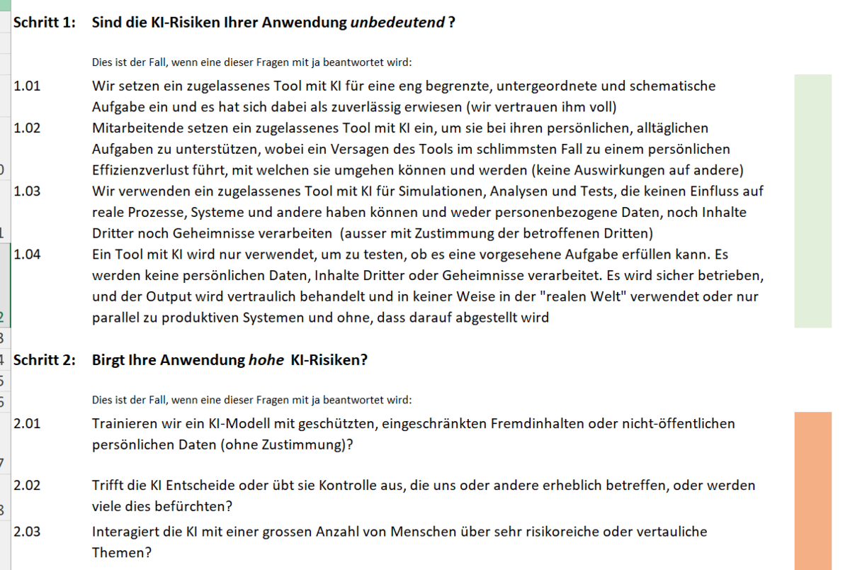 - Tiefe Risiken: Alle Anwendungen, welche gemäss dem Fragenkatalog weder hohe noch mittlere Risiken aufweisen und nicht unbedeutend sind, fallen automatisch in diese Kategorie, wie beispielsweise die Transkription von Gesprächsinhalten oder Erstellung von Kundenanschreiben.