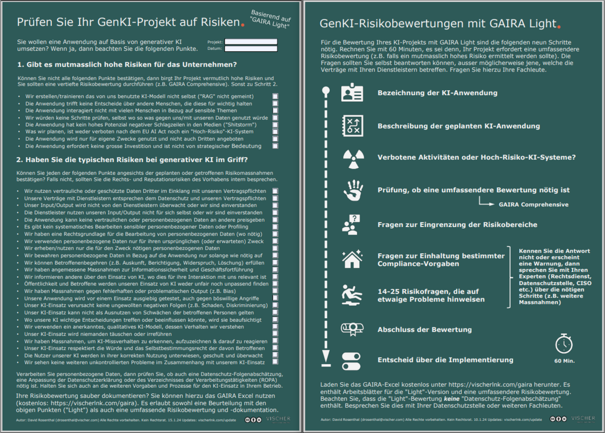 Zur Durchführung und Dokumentation des vorstehenden Prozesses haben wir eine passende Vorlage entwickelt. Sie steht unter dem Namen "GAIRA Light" als Excel-Arbeitsblatt kostenlos zum Download hier zur Verfügung (auf Deutsch und Englisch). Ergänzend dazu haben wir auch einen Fragebogen (mit den Fragen zur Identifikation von risikoreichen Anwendungen und den 25 Anforderungen für "normale" Projekte) sowie eine Kurzanleitung für GAIRA Light erstellt (sie sind hier abrufbar):