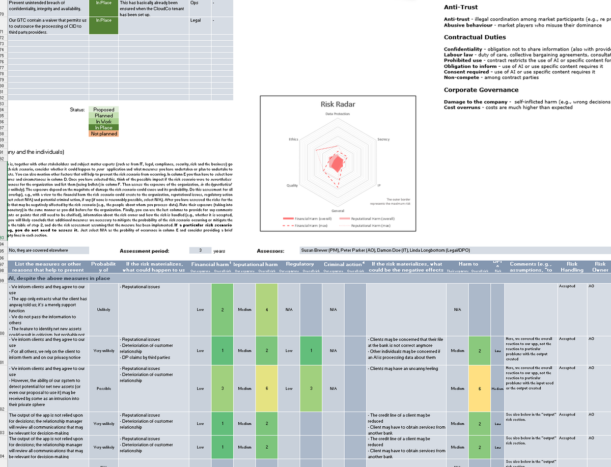 Zur Durchführung und Dokumentation des vorstehenden Prozesses haben wir auch hier eine passende Vorlage entwickelt. Sie steht unter dem Namen "GAIRA Comprehensive" als Excel-Arbeitsblatt kostenlos zum Download hier zur Verfügung und enthält eine beispielhafte Befüllung für ein imaginäres KI-Projekt. Die Vorlage enthält auch ein Arbeitsblatt zur Prüfung der rechtlichen Compliance von KI-Projekten. Dieses ist jedoch optional und braucht unserer Ansicht nach nicht ausgefüllt zu werden, da die meisten Fragen sowieso bereits im Rahmen der Risikobeurteilung geprüft werden (wenn die TOM diskutiert werden) oder als Teil der üblichen Compliance-Prüfung.